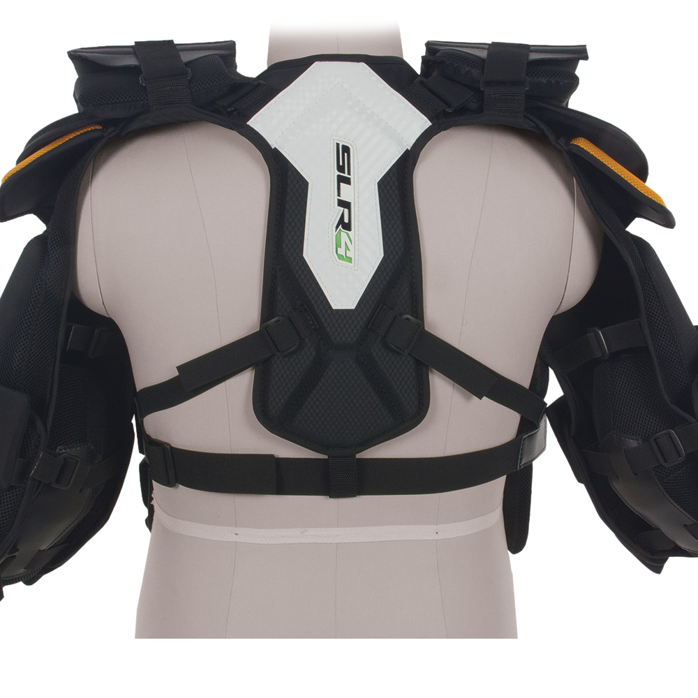 - Chest pad design stays higher on shoulders for increased blocking surface